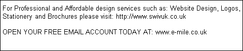 2) Email advertising - As well as showing banners on our website on all pages, we also offer this unique service which enables you to place a text advert on the bottom of each email sent from our users - that mean's thousands of emails sent out each day all across the UK and the World will see your advert! For example: